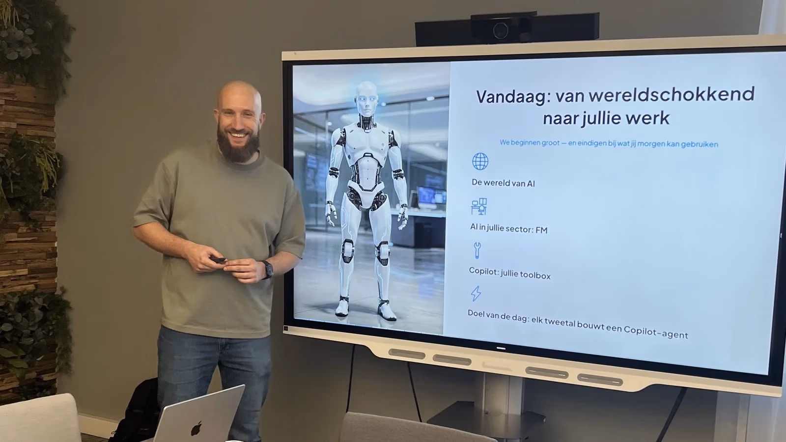 We starten met een inspirerend verhaal over de mogelijkheden. Daarna gaan de laptops open. Je schrijft je eerste eigen prompts of bouwt een agent. Je team gaat naar huis met skills die ze morgen direct gebruiken.